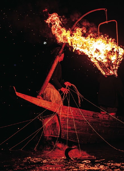 代々、伝統を受け継ぐ6名の鵜匠、卓越した船頭たちによる唯一無二、この一夜のためだけの鵜飼です。